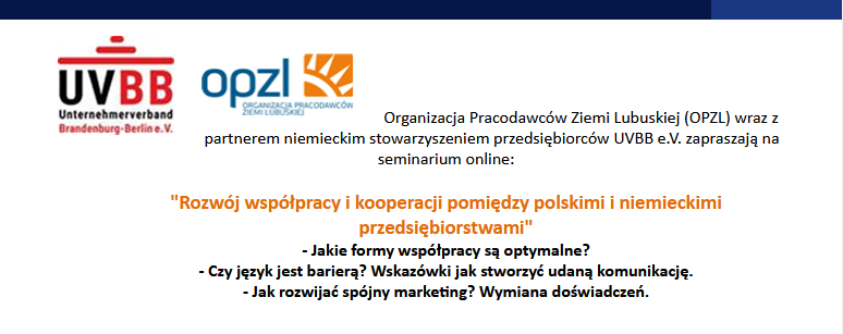 Organizacja Pracodawców Ziemi Lubuskiej (OPZL) wraz z partnerem niemieckim stowarzyszeniem przedsiębiorców UVBB e.V. zapraszają na seminarium online: